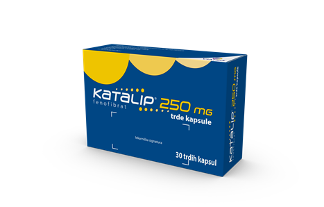 Katalip 250 mg trde kapsule. Sestava: Ena trda kapsula vsebuje 250 mg fenofibrata. Vsebuje saharozo. Indikacije: Kot dodatek k dieti in drugim nefarmakološkim načinom zdravljenja za: zdravljenje hude hipertrigliceridemije z nizkimi ali neznižanimi ravnmi HDL holesterola; zdravljenje mešane hiperlipidemije, kadar je zdravljenje s statini kontraindicirano ali jih bolnik ne prenaša; mešana hiperlipidemija pri bolnikih z visokim tveganjem za srčnožilne dogodke dodatno k zdravljenju s statini, kadar trigliceridi in holesterol HDL niso pod ustreznim nadzorom. Odmerjanje in način uporabe: Odziv na zdravljenje je potrebno spremljati z merjenjem vrednosti serumskih lipidov. Če po nekaj mesecih ni zadostnega odziva, je potrebno uvesti dopolnilno ali drugačno zdravljenje. Odmerjanje: Odrasli: Priporočeni dnevni odmerek je ena kapsula po 250 mg pri glavnem obroku. Med zdravljenjem je treba upoštevati dieto, ki ustreza tipu hiperlipoproteinemije. Starejši bolniki: Priporoča se običajni odmerek, razen v primeru zmanjšanega delovanja ledvic z ocenjeno hitrostjo glomerularne filtracije < 60 ml/min/1,73 m2. Bolniki z okvaro ledvic: Fenofibrata se ne sme uporabljati, če je prisotna huda ledvična okvara, opredeljena z eGFR < 30 ml/min na 1,73 m2. Če je eGFR med 30 in 59 ml/min na 1,73 m2, odmerek fenofibrata ne sme presegati 100 mg standarda ali 67 mg mikroniziranega enkrat na dan. Če se med spremljanjem ugotovi vztrajno zmanjševanje eGFR do <30 ml/min na 1,73 m2, je treba fenofibrat ukiniti. Bolniki z okvaro jeter: Uporaba zdravila Katalip pri bolnikih z jetrno insuficienco je kontraindicirana. Pediatrična populacija: Uporaba fenofibrata pri otrocih in mladostnikih, starih do 18 let, ni priporočljiva. Način uporabe: Kapsulo je potrebno pogoltniti celo med obrokom. Kontraindikacije: Preobčutljivost na učinkovino ali katero koli pomožno snov, jetrna insuficienca (vključno z biliarno cirozo in nepojasnjenim vztrajajočim nenormalnim delovanjem jeter), znana bolezen žolčnika, huda ledvična insuficienca (ocenjena hitrost glomerularne filtracije < 30 ml/min/1,73 m2), kronični ali akutni pankreatitis z izjemo akutnega pankreatitisa zaradi hude hipertrigliceridemije, znana fotoalergija ali fototoksične reakcije med zdravljenjem s fibrati ali ketoprofenom. Posebna opozorila in previdnostni ukrepi: Sekundarni vzroki hiperlipidemije, kot so nenadzorovani diabetes mellitus tipa II, hipotiroidizem, nefrotični sindrom, disproteinemija, obstruktivna bolezen jeter, zdravljenje z zdravili in alkoholizem, naj bodo ustrezno zdravljeni pred uvedbo zdravljenja s fenofibratom. Delovanje jeter: Priporočeno je merjenje vrednosti transaminaze vsake 3 mesece v prvem letu zdravljenja, nato pa periodično. Če se pojavi hepatitis, je potrebno prekiniti zdravljenje s fenofibratom. Trebušna slinavka: Pri bolnikih, ki so jemali fenofibrat, so poročali o pankreatitisu. Mišice: Poročali so mišični toksičnosti, vključno z zelo redkimi primeri rabdomiolize, z ali brez ledvične odpovedi. V takih primerih je potrebno zdravljenje s fenofibratom prekiniti. Delovanje ledvic: Zdravilo je kontraindicirano pri hudi ledvični okvari. Previdnost pri bolnikih z blago do zmerno ledvično insuficienco. Prilagoditev odmerka je potrebna pri bolnikih, pri katerih je ocenjena hitrost glomerularne filtracije 30 do 59 ml/min/1,73 m2. Zdravljenje je treba prekiniti, ko je nivo kreatinina 50 % nad zgornjo mejo normalne vrednosti. Priporočljivo je merjenje kreatinina v prvih 3 mesecih po začetku zdravljenja, nato pa v rednih časovnih obdobjih še naprej. Pomembne informacije: Zdravilo Katalip vsebuje saharozo. Bolniki z redko dedno intoleranco za fruktozo, malabsorpcijo glukoze/galaktoze ali pomanjkanjem saharoza-izolmataze ne smejo jemati tega zdravila. To zdravilo vsebuje manj kot 1 mmol natrija (23 mg) na tableto, kar v bistvu pomeni ‘‘brez natrija‘‘. Medsebojno delovanje z drugimi zdravili in druge oblike interakcij: Peroralni antikoagulanti: Fenofibrat poveča učinek peroralnih antikoagulantov in lahko poveča tveganje za krvavitve. Ciklosporin: Med sočasno uporabo fenofibrata in ciklosporina je potrebno skrbno spremljati delovanje ledvic in v primeru hudih sprememb laboratorijskih parametrov takoj prekiniti zdravljenje s fenofibratom. Zaviralci HMG-CoA reduktaze in drugi fibrati: Večje tveganje za povečano mišično toksičnost. Glitazoni: Priporočeno spremljanje HDL-holesterola, če se eno od teh dveh zdravil doda drugemu in ukinitev enega od zdravljenje, če so vrednosti HDL-holesterola prenizke. Encimi citokrom P450: Bolnike, ki sočasno jemljejo fenofibrat in zdravila, ki se presnavljajo z encimi CYP2C19, CYP2A6 in zlasti CYP2C9 ter imajo ozek terapevtski indeks, je potrebno skrbno spremljati in po potrebi prilagoditi odmerke teh zdravil. Neželeni učinki: Pogosti neželeni učinki so: želodčno-črevesni znaki in simptomi (bolečina v trebuhu, navzea, bruhanje, driska in flatulenca), povišane vrednosti serumskih transaminaz, povišana raven homocisteina v krvi. Občasni neželeni učinki so: glavobol, trombembolizem, pankreatitis, holelitiaza, kožna preobčutljivost, mišične bolezni, motnje v spolnosti, povišane vrednosti kreatinina v krvi. Pakiranje: Škatla s 30 kapsulami. Režim in način izdajanja zdravila: Rp. Imetnik dovoljenja za promet: Viatris Healthcare Limited, Damastown Industrial Park, Mulhuddart, Dublin 15, DUBLIN, Irska. Datum revizije: November 2022. Za dodatne informacije glejte celoten Povzetek glavnih značilnosti zdravila.